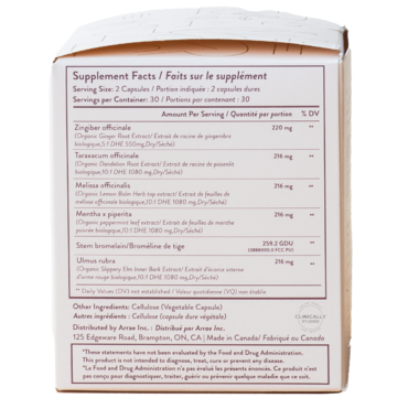 Organic Ginger Extract, Rhizome (Zingiber officinale) - 220mg per serving. Organic Dandelion Root Extract, Organic Lemon Balm Herb Top Extract, Organic Peppermint Leaf Extract, Organic Bromelain, Organic Slippery Elm Inner Bark Extract - 1080mg per serving.