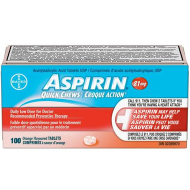 ASPIRIN has been trusted for over 100 years and ASPIRIN 81mg is the #1 Doctor recommended brand of low dose acetylsalicylic acid (ASA) for doctor supervised long-term preventive therapy. ASPIRIN 81mg quick chews come in a great tasting orange flavoured tablets that could be chewed or swallowed whole.