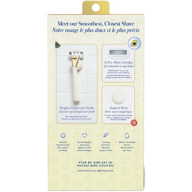 Athena Clubs Razor Kit has been designed, tested, and retested for how people actually shave. The innovative, curve-loving, body-knowing razor features five spaced-out blades, a built-to-last aluminum handle coated with non-slip silicone, and a moisturizing hyaluronic acid serum strip to prevent bumps, razor burn, and irritation. In addition to providing an upgraded shaving experience, the Razor Kit boasts an innovative, unique design that is sure to elevate your bathroom's setting.