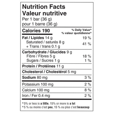 Protein blend (milk protein isolate, whey protein isolate, sodium caseinate), Palm kernel oil, Polydextrose, Whole wheat flour, Almond flour, Palm oil, Peanuts, Peanut oil, Soy lecithin, Whey powder, Soybean oil, Vegetable glycerin, Salt, Natural flavours, Baking soda, Mono- and Di-glycerides, Tocopherols, Sucralose. Polydextrose: 4.1 g per 36 g bar. Sucralose: 21.8 mg per 36 g bar. Contains: Milk, Wheat, Almonds, Peanuts, Soy. May contain: Brazil nuts, Cashews, Hazelnuts, Macadamia nuts, Pecans, Pistachios, Walnuts.