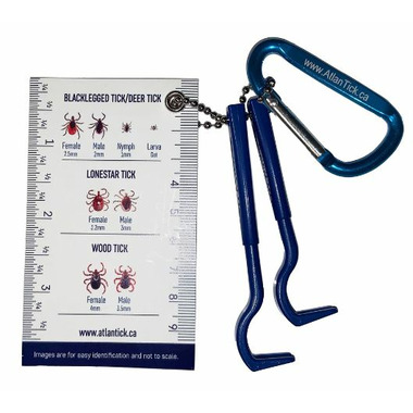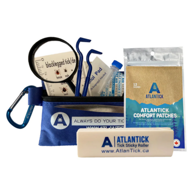 AtlanTick's Water Resistant Tick Kit contains: a magnifying glass, a pair of pointed tweezers, Tick Pick, bandages, alcohol swabs, a pair of latex gloves, a tick id card, a vial to put ticks in once removed, and a sticky roller to capture less visible ticks.