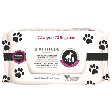 ATTITUDE 100% biodegradable Natural Pet Grooming Wipes are ready whenever you need them as a great bath alternative. They are strong, all-natural, biodegradable, and hypoallergenic for your pet’s sensitive skin. Fragrance-free.