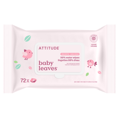 ATTITUDE baby leaves vegan wipes fragrance-free gently cleanse your babys delicate skin. Made with 99% water, they are designed to respect the fragile skin of little ones. Convenient and durable, they dispense one at a time and are perfect for both diaper changes and everyday messes.