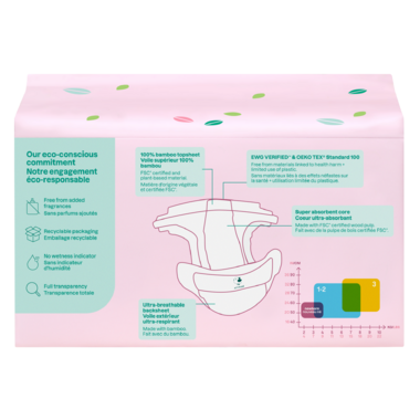 Fear no more leaks, with ATTITUDE's new vegan eco-conscious disposable diapers for newborns, which offer optimum absorption and keep baby dry. Their EWG Verified certification is a guarantee of total transparency on ingredients and manufacturing materials. These diapers are therefore free from contaminants linked to adverse health effects. To protect babies' delicate skin, they have no added fragrances and are OEKO-TEX Standard 100 certified, offering daily confidence. To make no compromise between environmental preservation and performance, the diapers are made from bamboo sourced from FSC eco-managed forests.