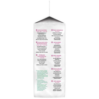 Materials: FSC-certified totally chlorine-free (TCF) cellulose pulp, superabsorbent polymer (SAP), biodegradable corn starch-based biopolymer, nonwoven fabric (polymers) and elastics (latex-free)