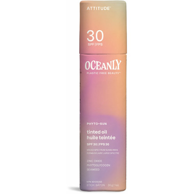 Discover ATTITUDE'S new Phyto-Sun mineral oil SPF 30 tinted stick: a revolutionary skincare that leaves your complexion with a natural finish. Enriched with non-nano zinc oxide, its silky, light formula protects against UVA and UVB rays, without leaving a white cast. It combines naturally-sourced ingredients such as phytoglycogen to help restore skin radiance, seaweed extracts with revitalizing properties and vegan collagen-like for a hydrated skin. Plastic-free, EWG VERIFIED™ and vegan, PHYTO-SUN tinted oil is packaged in an FSC biodegradable cardboard tube.