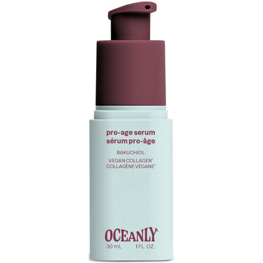 Oceanly Pro-Age Serum combines powerful ingredients that target visible signs of aging for smoother, more supple, and revitalized skin. Specifically formulated for mature skin, its silky, fluid texture glides effortlessly over the face and absorbs quickly without a sticky finish. Made with 97.8% naturally derived ingredients*, this formula features four star pro-aging actives. Bakuchiol, a plant-based alternative to retinol, is known to help improve skin firmness and elasticity. Vegan collagen helps maintain hydration and support the skins structure. Hyaluronic acid, recognized for its ability to attract and retain water, helps plump the skin and visibly smooth fine lines and wrinkles. Finally, peptides support skin function and contribute to a visibly firmer appearance.