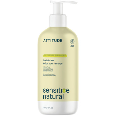 ATTITUDE Sensitive Natural Body Lotion Vanilla Cream is ideal for nourishing delicate skin. Formulated with 99% naturally sourced ingredients, this lotion contains oat extract known for its soothing properties to improve the appearance of dry skin.EWG Verified, dermatologically tested, and vegan, it nourishes your skin daily with its light, non-greasy texture, and let yourself be carried away by its peach fragrance delicately blended with sweet notes of vanilla.