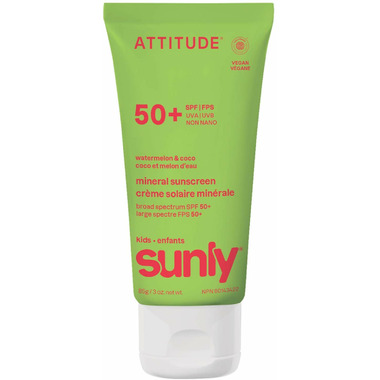 Sunly kids protects your little one's skin. The ATTITUDE SPF 50 sunscreen is specially formulated for kids, with non-nano zinc oxide, a mineral filter that forms a physical barrier on your skin, offering broad-spectrum protection against UVA and UVB rays. EWG Verified and dermatologically tested, its light, fluid texture applies easily on the face and body while leaving a sheer finish. Perfect for quick and gentle applications on little ones eager to run off and play in the sun. Delicately scented with coconut and juicy watermelon, it turns application time into a fun and cheerful moment that smells just like summer.