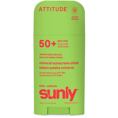 Sunly kids protects your little one's skin.The ATTITUDE SPF 50 sunscreen stick is specially formulated for kids, with non-nano zinc oxide, a mineral filter that forms a physical barrier on your skin, offering broad-spectrum protection against UVA and UVB rays. EWG Verified and dermatologically tested, its lightweight formula glides smoothly onto the skin, leaving a non-greasy sheer finish. Compact and convenient, this on-the-go format can be taken anywhere and applied in one easy swipe to the body and face, perfect for little ones eager to run off and play in the sun! Delicately scented with coconut and juicy watermelon, it turns application time into a fun and cheerful moment that smells just like summer.