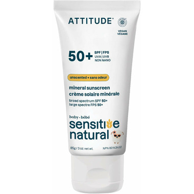The ATTITUDE Sensitive Natural Baby SPF 50 sunscreen is specially formulated for sensitive-skin babies, with non-nano zinc oxide, a mineral filter that forms a physical barrier on your skin, offering broad-spectrum protection against UVA and UVB rays. Enriched with oat extract to help soothe dry skin and restore softness, this gentle formula offers both care and comfort. EWG Verified and dermatologically tested, its light, fluid texture applies easily on the face and body while leaving a sheer finish. Perfect for quick and gentle application. Unscented, this sunscreen is designed for your little one’s delicate skin from 6 months onward.