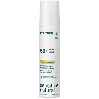 ATTITUDE Sensitive natural SPF 50 sunscreen spray is formulated with non-nano zinc oxide, a mineral filter that forms a physical barrier on your skin, offering broad-spectrum protection against UVA and UVB rays. Water-resistant for 80 minutes, it provides lasting protection even during water activities. Specially developped for sensitive skin, it is enriched with oat extract to help soothe dry skin and restore softness. EWG Verified and dermatologically tested, its light and fluid texture applies easily on the body and face thanks to its precise spray format while leaving a non-greasy, sheer finish. Unscented, it is ideal for scent-sensitive skin.