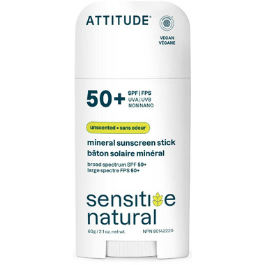 The ATTITUDE's Sensitive Natural SPF 50 sunscreen stick is formulated with non-nano zinc oxide, a mineral filter that forms a physical barrier on your skin, offering broad-spectrum protection against UVA and UVB rays. Specially developped for sensitive skin, it is enriched with oat extract to help soothe dry skin and restore softness. EWG Verified and dermatologically tested, its lightweight formula glides smoothly onto the skin, leaving a non-greasy sheer finish. Compact and convenient, this on-the-go format can be carried anywhere and applied in one easy swipe to the body and face. Fragrance-free, it is ideal for scent-sensitive skin.