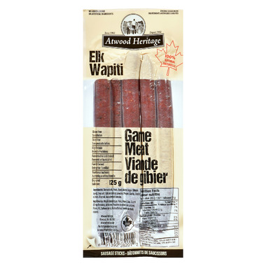 The Game Meats Elk Sausage Sticks are a 100% natural sausage made with domestic elk, that is blended with pork and beef creating a unique delicious flavour. The Elk Sausage Sticks are made savory using a delicious easy-to-read blend of spices and slightly sweetened with maple syrup.