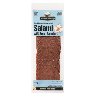 The Game Meats Wild Boar Sliced Salami is a 100% natural salami made with domestic wild boar that is blended with pork and beef creating a unique delicious flavour. They have meaty texture and delightful flavour. The savory Wild Boar Sliced Salami is made using a delicious easy-to-read blend of spices and slightly sweetened with cane sugar.