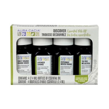 Aura Cacia Discover Essential Oils Kit contains Lavender, Tea Tree, Sweet Orange & Peppermint scents.