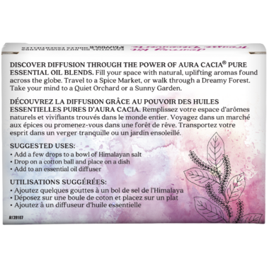 Quiet Orchard: Abies balsamea (balsam fir needle) oil, Citrus reticulata (tangerine) oil, Citrus aurantifolia (lime) oil, organic Copaifera officinalis (copaiba) oil, Elettaria cardamomum (cardamom) oil, Gaultheria fragrantissima (wintergreen) oil. Dreamy Forest: Citrus limon (lemon) oil, Myroxylon balsamum (balsam Peru) oil, organic Cananga odorata (ylang ylang) oil, Citrus aurantium (petitgrain) oil, Mentha spicata (spearmint) oil, Jasminum grandiflorum (jasmine absolute) oil. Spice Market: Citrus limon (lemon) oil, Cinnamomum aromaticum (cinnamon) oil, Syzygium aromaticum (clove bud) oil, organic Copaifera officinalis (copaiba) oil, Citrus reticulata (Mandarin orange) oil, Elettaria cardamomum (cardamom) oil. Sunny Garden: Citrus sinensis (sweet orange) oil, Lavandula angustifolia (lavender) oil, Lavandula intermedia (lavandin) oil, Pogostemon cablin (patchouli) oil, Helichrysum italicum (immortelle) oil, Chammelum nobile (Roman chamomile) oil.