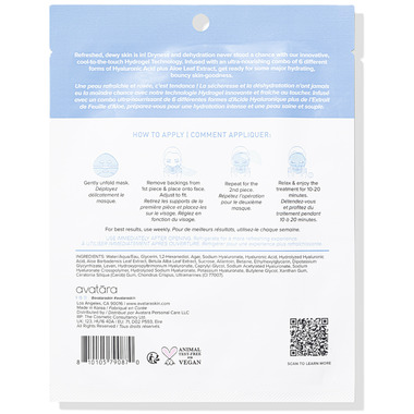 Directions: 1. (AM or PM) Start with clean, dry skin. 2. Gently unfold mask and apply Hydrogel-side down onto face. 3. Remove backings, adjust mask to fit & repeat with 2nd piece. 4. Relax and remove after 10-20 minutes. For best results, use at least 1x per week.