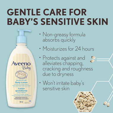 Aveeno Baby Daily Lotion is a naturally nourishing moisturizing lotion. This lotion is specially formulated to soothe and moisturize your baby’s delicate, dry skin. It is even gentle enough for newborns. From the number-one pediatrician recommended baby brand, Aveeno Baby Daily Lotion can be used every day to keep your baby's skin soft, smooth, and healthy-looking. Natural colloidal oatmeal blended with rich emollients moisturizes and protects skin for a full 24 hours. Aveeno Baby Daily Lotion is hypoallergenic and fragrance-free, so it is perfect for your baby’s sensitive skin.
