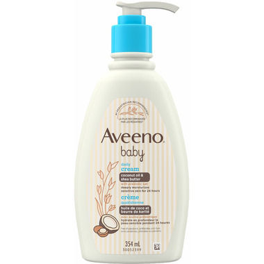 - Help keep babys developing skin feeling and looking healthy with Aveeno Baby Daily Moisturizing Cream. This cream is made with nourishing prebiotic oat, coconut oil and shea butter. One bottle of this baby cream contains 354-milliliters of product.