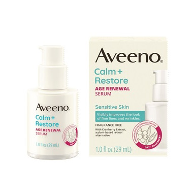 Visibly improve the look of fine lines and wrinkles with Aveeno Calm + Restore Age Renewal Serum. This lightweight fragrance-free formula leaves skin feeling smoother & healthier in just one week, and contains nourishing oat, niacinamide (Vitamin B3), and cranberry extract, a gentle retinol alternative that's clinically proven to visibly improve the look of fine lines & wrinkles while helping to strengthen the skinΒs moisture barrier. This hydrating serum from Aveeno , a dermatologist-recommended skincare brand for over 70 years, works to visibly improve multiple signs of aging skin. Tested and proven to be gentle on sensitive skin, and suitable for all skin tones, the hydrating facial serum improves the look of skin without causing redness, dryness, or sensitivity. The nourishing formula contains cranberry extract, a gentle plant-based retinol alternative with antioxidant-rich peptides that are clinically proven to visibly reduce the signs of aging. The skin-smoothing serum is also enriched with nourishing colloidal oatmeal to soothe dry skin plus niacinamide (Vitamin B3), which helps to improve skin's tone and texture for smoother, brighter looking skin. Gentle enough for daily use as part of your skincare routine, the hypoallergenic age renewal serum is fragrance-free, paraben-free, phthalate-free, dye-free, alcohol-free, and non-comedogenic, which means it wonΒt clog pores or causes breakouts. This product comes in a 29 mL bottle, and can be used with Aveeno Calm + Restore Age Renewal Eye Gel.