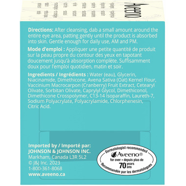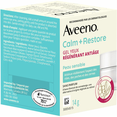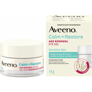 Visibly improve the look of wrinkles and crows feet with AveenoҮ Calm + Restore Age Renewal Eye Gel. This rejuvenating eye gel contains nourishing oat, niacinamide, and cranberry extract, to improve the look of puffiness and dullness in just one week. This hydrating formula from Aveeno, a dermatologist recommended brand for over 70 years, works to visibly improve multiple signs of tired or aging skin around the eyes, including the look of wrinkles, crowΒs feet, puffiness, and dark circles. Tested and proven to be gentle on sensitive skin, and suitable for all skin tones, the under-eye gel improves the look of skin without redness or sensitivity. The nourishing formula contains cranberry extract, a gentle retinol alternative that's clinically proven to visibly improve the look of fine lines & wrinkles while helping to strengthen the skins moisture barrier . The firming eye gel is also enriched with colloidal oatmeal to soothe dry skin plus niacinamide (Vitamin B3) which helps to improve skin tone and texture for smoother, brighter-looking skin. AveenoҮ Calm + Restore Age Renewal Eye Gel is suitable to be used under makeup, and can be combined with Aveeno Calm + Restore Age Renewal Serum as part of your daily skincare routine. One jar of Aveeno Calm + Restore Age Renewal Eye Gel comes with 14 grams of product.