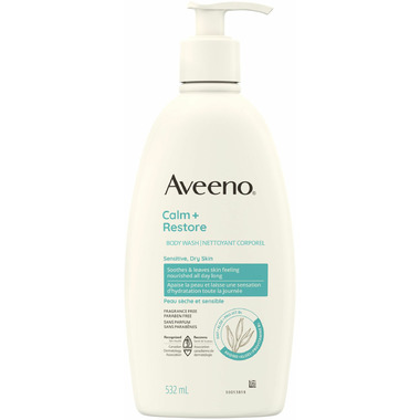 Cleanse sensitive and dry skin with Aveeno Calm + Restore Body Wash. This daily body wash is formulated with oat, aloe, and pro-vitamin B5 to soothe skin, leaving it feeling nourished all day long. From a dermatologist recommended brand for over 70 years, this daily body wash soothes and nourishes skin to leave it feeling moisturized. Made with a rich formula, this product contains antioxidant oat, aloe, and pro-vitamin B5 to gently cleanse and leave skin feeling soothed all day long. The body wash is gentle enough for daily use on all skin types and is paraben free, soap free, sulfate free, and dye free. Aveeno Calm + Restore Body Wash comes packaged in a bottle made with 30% Post-Consumer Recycled Plastic. This product comes in a 532-millilitre bottle of fragrance free body wash.