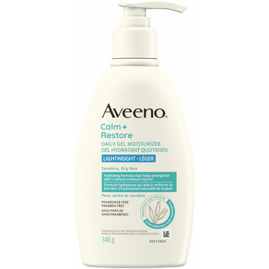 Experience the soothing and resilient power of Aveeno Calm + Restore Daily Gel Moisturizer. Designed to alleviate sensitive and dry skin for 48-hours, this lightweight gel moisturizer is crafted with prebiotic oat, aloe, and Pro-Vitamin B5. Feel the transformative effects of this lightweight formula as it infuses your skin with hydration and dry skin relief. Developed by a dermatologist recommended brand for over 70 years, this nourishing lotion is specially formulated to cater to the needs of dry and sensitive skin. Its fast-absorbing gel texture provides a seamless application and allows for immediate absorption, leaving your skin feeling soothed, revitalized, and resilient. The power of prebiotic oat, derived from non-GMO oats, combined with rejuvenating aloe and Pro-Vitamin B5, works to provide moisturization to your skin. This gentle and non-comedogenic gel is fragrance free, dye free, and paraben free. The Aveeno Calm + Restore Gel Moisturizer is packaged in a bottle made from 30% Post-Consumer Recycled Plastic. This product comes in a 340-gram bottle of fragrance free body moisturizer.