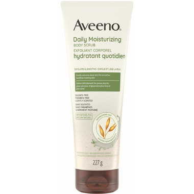 - Gently remove dead skin for smoother, healthier-looking skin with Aveeno Daily Moisturizing Body Scrub. This creamy body scrub moisturizes as it removes dead surface layers. Aveeno Body Scrub comes in a 227-gram tube of product.