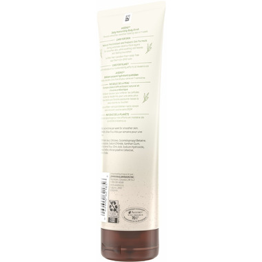 - This moisturizing body scrub is formulated with non-GMO prebiotic oat. The skin-smoothing formula contains soothing non-GMO oat to leave skin feeling soft and moisturized, and is non-greasy, soap-free, and dye-free.
