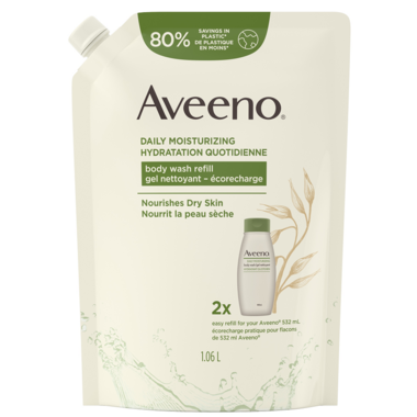 Aveeno Daily Moisturizing Body Wash Pouch helps to lock in moisture resulting in softer, smoother skin long after you shower. The creamy body wash is formulated with soothing oat and rich emollients to lock in moisture resulting in softer, smoother skin that lasts for noticeably healthier-looking skin. Aveeno Daily Moisturizing Body Wash is perfect for daily use in the shower or bath. This moisturizing body wash with soothing oat is formulated without parabens, phthalates, dyes, soap and alcohol. Care for the planet while cleansing and moisturizing your skin with Aveeno Moisturizing Body Wash.
