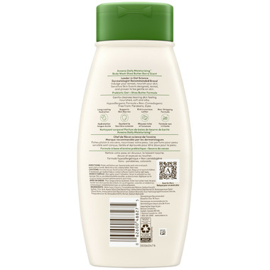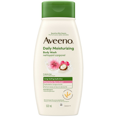 • 532-millilitre bottle of Aveeno Daily Moisturizing Body Wash with prebiotic oat, shea butter & berry scent. This daily body cleanser gently removes impurities while nourishing & leaving sensitive skin feeling soft, silky, smooth, & hydrated.