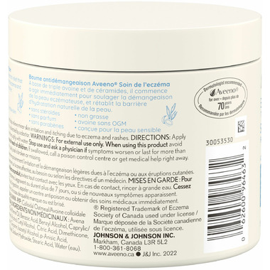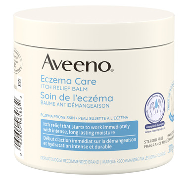 • This long lasting itch relief balm is from a dermatologist recommended brand for over 70 years and is accepted by the Eczema Society of Canada. Aveeno's Eczema Care Itch Relief Balm provides instant relief and soothes your dry, itchy skin.
