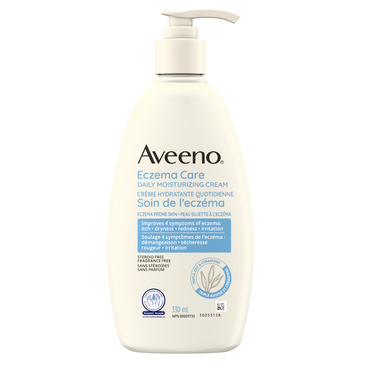 - Aveeno Eczema Care Daily Moisturizing Cream helps improve the symptoms of eczema. This daily moisturizer helps relieve irritated, itchy skin. This product comes in a 330-millilitre bottle of fragrance free eczema care moisturizing cream. This bottle is made with 30% Post-Consumer Recycled Plastic.