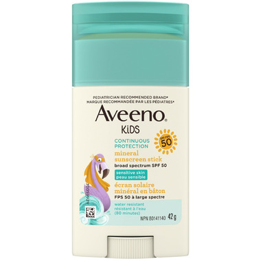 - 42-grams of Aveeno Kids Continuous Protection Mineral Sunscreen with broad spectrum SPF 50 is sun protection specially designed for children's delicate& sensitive skin
