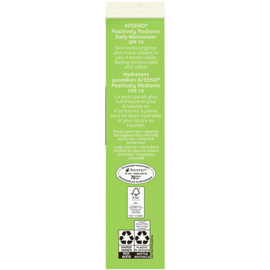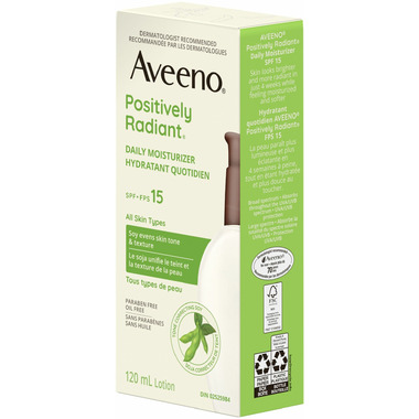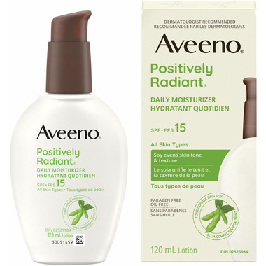 • Get brighter, more radiant looking skin with Aveeno Positively Radiant Daily Moisturizer with SPF 15. This face moisturizer has a soy formula and softens skin while evening out tone and texture. This non-greasy moisturizer comes in a 120-millilitre bottle of cream. Bottle is made from 30% post consumer recycled (PCR) plastic.