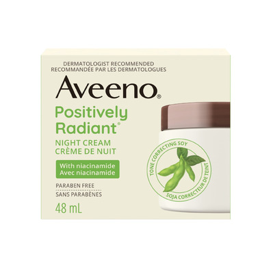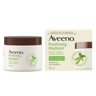 - Aveeno Positively Radiant Night Cream comes from a dermatologist recommended brand for over 70 years. Formulated effectively with tone correcting soy and niacinamide, this night cream will reveal your skin's radiance.