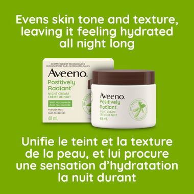 - Wake up to healthy looking skin with Aveeno Positively Radiant Night Cream. This night cream is designed to even skin tone and texture while keeping your skin hydrated all night long. This cream comes in a 48-millilitre jar.