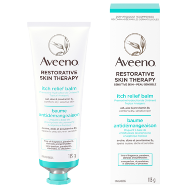 Comfort dry, itchy skin with Aveeno Restorative Skin Therapy Itch Relief Balm is gentle enough for sensitive skin. This anti-itch cream contains Pramoxine HCl, soothing aloe, provitamin B5, and moisturizing prebiotic oat, an antioxidant known to soothe dry, itchy skin discomfort.