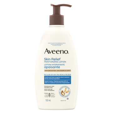 Aveeno Skin Relief Moisturizing Lotion is clinically proven soothing relief for itchy, dry skin with 48-hour moisture. Formulated with Triple Oat and shea butter that provides soothing relief for itchy, dry skin and locks in long lasting moisture. This skin relief moisturizing lotion is clinically proven to help relieve and soothe itchy and dry skin. The creamy shea moisture lotion has a rich formula that can be used on sensitive skin and can be used as part of your daily skincare routine. From a dermatologist recommended brand, the fragrance free Aveeno Skin Relief Moisturizing Lotion has a non-greasy formula that is paraben free, dye free, non-comedogenic, non-GMO oats, and allergy tested. Moisturize sensitive skin for 48 hours with Aveeno Skin Relief Moisturizing Lotion. The fragrance free moisturizing lotion helps heal and relieve itchy and dry skin.