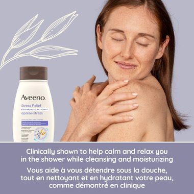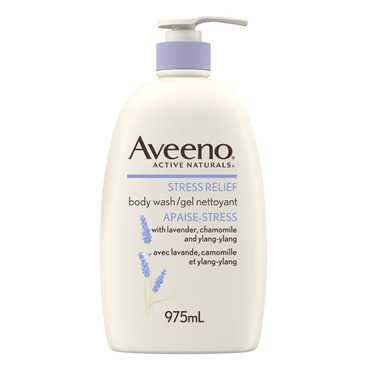 - Aveeno Stress Relief Body Wash 975 mL with Colloidal Oatmeal for moisturizing and soothing dry skin