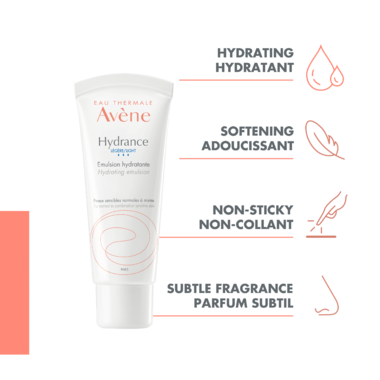 - Thanks to its patented Cohederm complex, Hydrance Light Hydrating emulsion: lastingly hydrates the skin, provides long-lasting soothing relief by restoring the skin's water reservoirs, that concentrate Avene Thermal Spring Water.