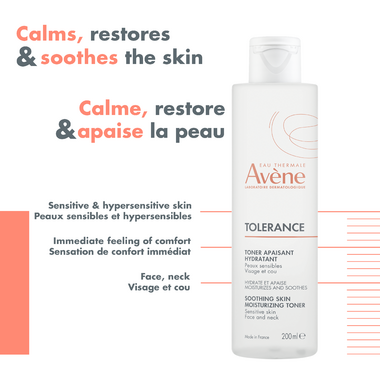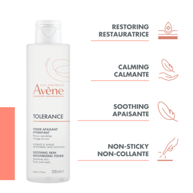 Discover the new TOLERANCE SOOTHING SKIN MOISTURIZING TONER! The product is designed to provide calming and hydrating care for sensitive to hypersensitive skin, This no-rinse toner features a fresh, watery texture that is non-sticky and non-greasy, spreading easily and absorbing quickly to soften the skin, formulated with 99% natural origin ingredient, it is fragrance-free, and alcohol-free, making it perfect for sensitive skin, The star ingredient, TRP-Regulin, reduces skin discomfort and blocks inflammation, while glycerin and thermal water hydrate, restore the skin barrier, and boost the microbiome, Experience immediate relief from tightness, dryness, and burning sensations, with long-lasting effects that continue to reduce skin sensitivity with regular use, offering up to a 50% reduction in skin sensitivity after 28 days, elevate your skincare routine with Tolerance Soothing Skin Moisturizing Toner, where gentle care meets powerful results for those seeking comfort and hydration for their sensitive skin.