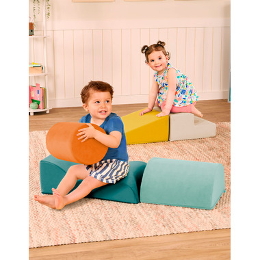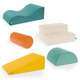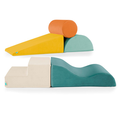 This set includes five soft shapes with varied textures and convenient handles: an off-white step (16 x 16 x 8.3"), a green-turquoise wave (16 x 24 x 8.3"), a yellow ramp (16 x 24 x 8.3"), a light-green half-cylinder (16 x 24 x 8.3") and an orange cylinder (16 x 8.3"). Each module comes with a washable cover for easy maintenance.