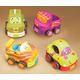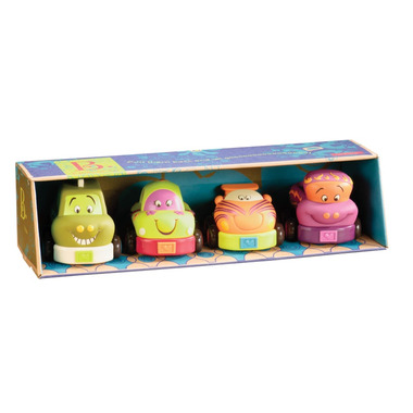 Pull them back and watch the B. Wheeee-ls goooo! Features 4 chunky vehicles with fun whimsical faces. Perfect for little hands to play with. Each vehicle has it's own distinctive sound; car rings, truck chimes, racer rattles and the taxi squeaks.