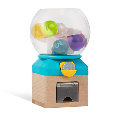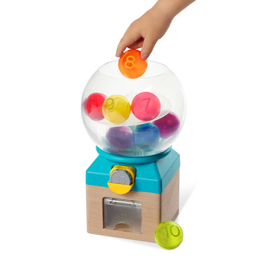 Pop out colorful gumballs and count em up with Rainbow Gumballs from B. Toys! This retro-inspired gumball machine dispenses learning with ease and looks great on a shelf thanks to its sturdy wooden base. Just fill it up with the 10 large, colorful balls and press down on the coin for a surprise! Babies will love chasing or crawling after the gumballs as they slide out of the chute, but the fun doesn't stop there. Make playtime a learning moment thanks to the bright colors and numbers 1-10 on the gumballs. Practice counting by filling the globe with balls 1 through 10, and then ask kiddos to tell you what number pops out! This counting gumball toy is great for gross motor skills, color recognition, and teaching numbers.