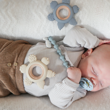This multifunctional pacifier clip easily attaches to pacifiers, soothers, teething toys, clothing, drool bibs, strollers, and more. Made from 100% food-grade silicone with a food-grade PP clip, it also provides an added sensory element that babies can safely explore during teething.