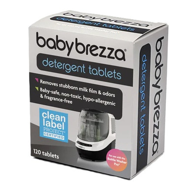 Exclusively made for the Baby Brezza Bottle Washer Pro, the detergent tablets remove stubborn milk residue and odour. The safe and powerful cleaning formulas are non-toxic, hypo-allergenic and fragrance-free. Detergent Tablets for Bottle Washer Pro - safe and powerful cleaning for your baby's bottles, pump parts & accessories.