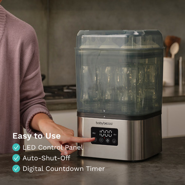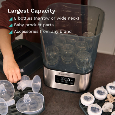 The fastest sterilizer dryer with the largest capacity. Automatically kills 99.9% of germs with natural steam, then dries with hot air in just 10 minutes. 75% faster than other brands. Holds up to 8 bottles, baby product parts, plus accessories, so everything you need is clean, dry, and ready to use.