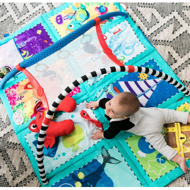 A clever play gym that converts from an activity mat to a play gym to a book! When babies are little, the oversized "busy blanket" mat keeps them comfortable and off of cold floors, with built-in activities; the sides of the mat can fold up to help keep baby contained. For extra support during tummy time, a prop pillow is included.